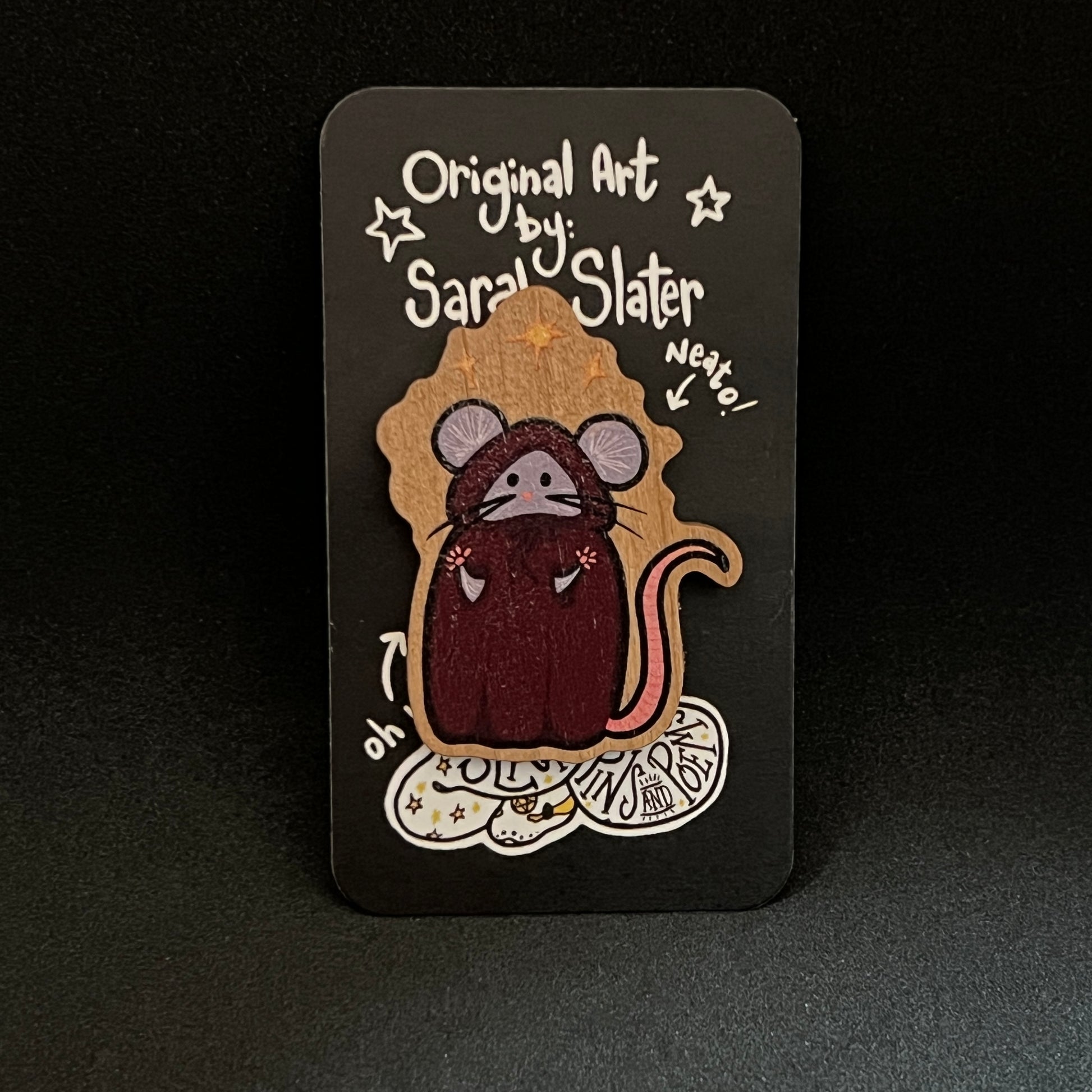 This wooden pin features the Patreon design from April 2024. Magic rat casting magic spells magically to ensure you have a wonderful day.