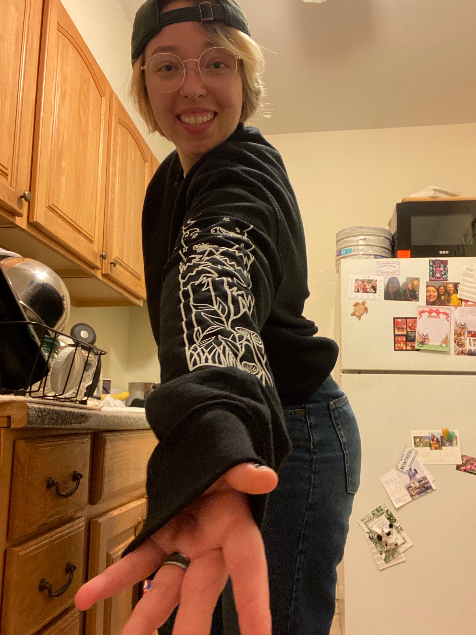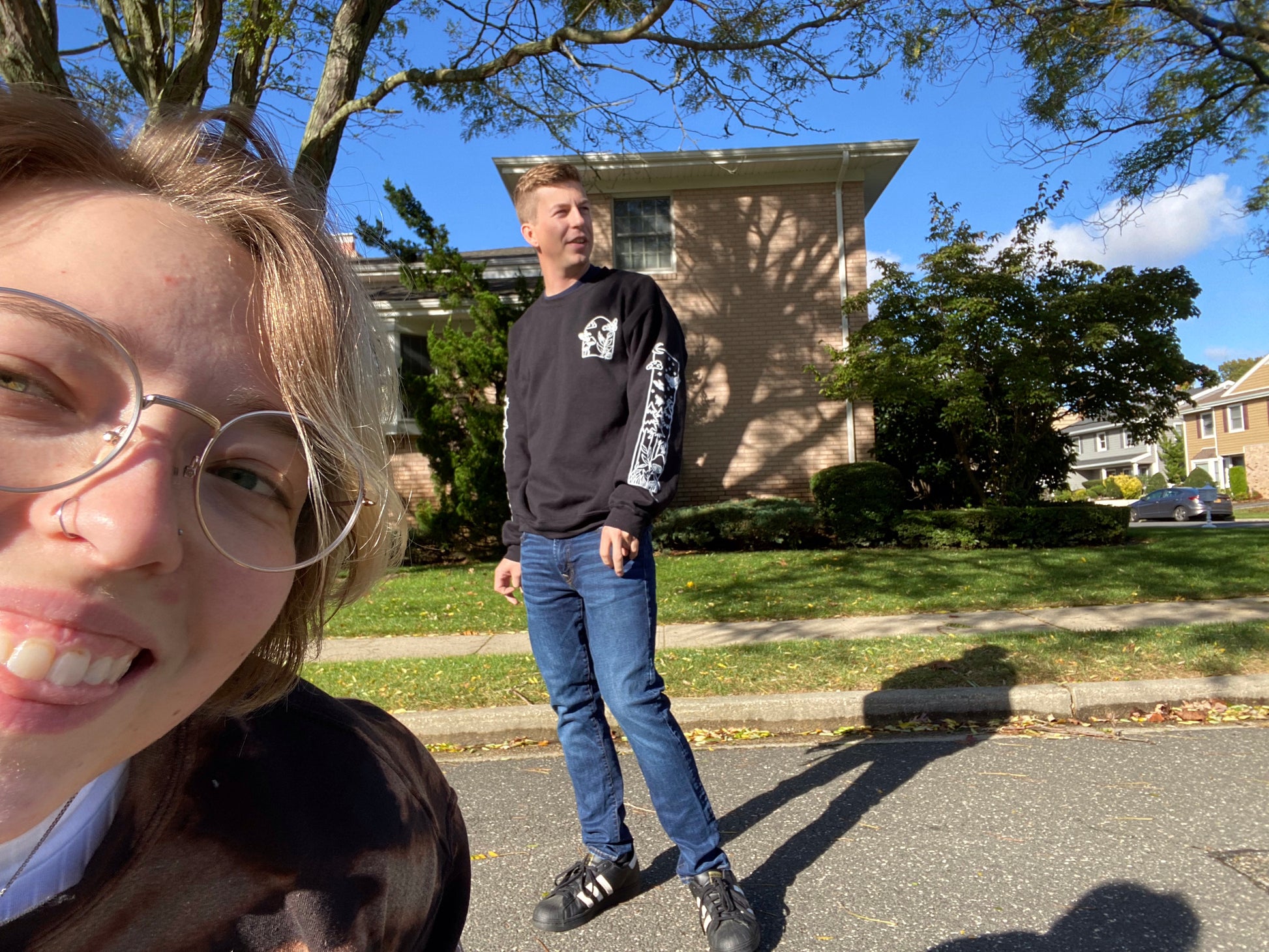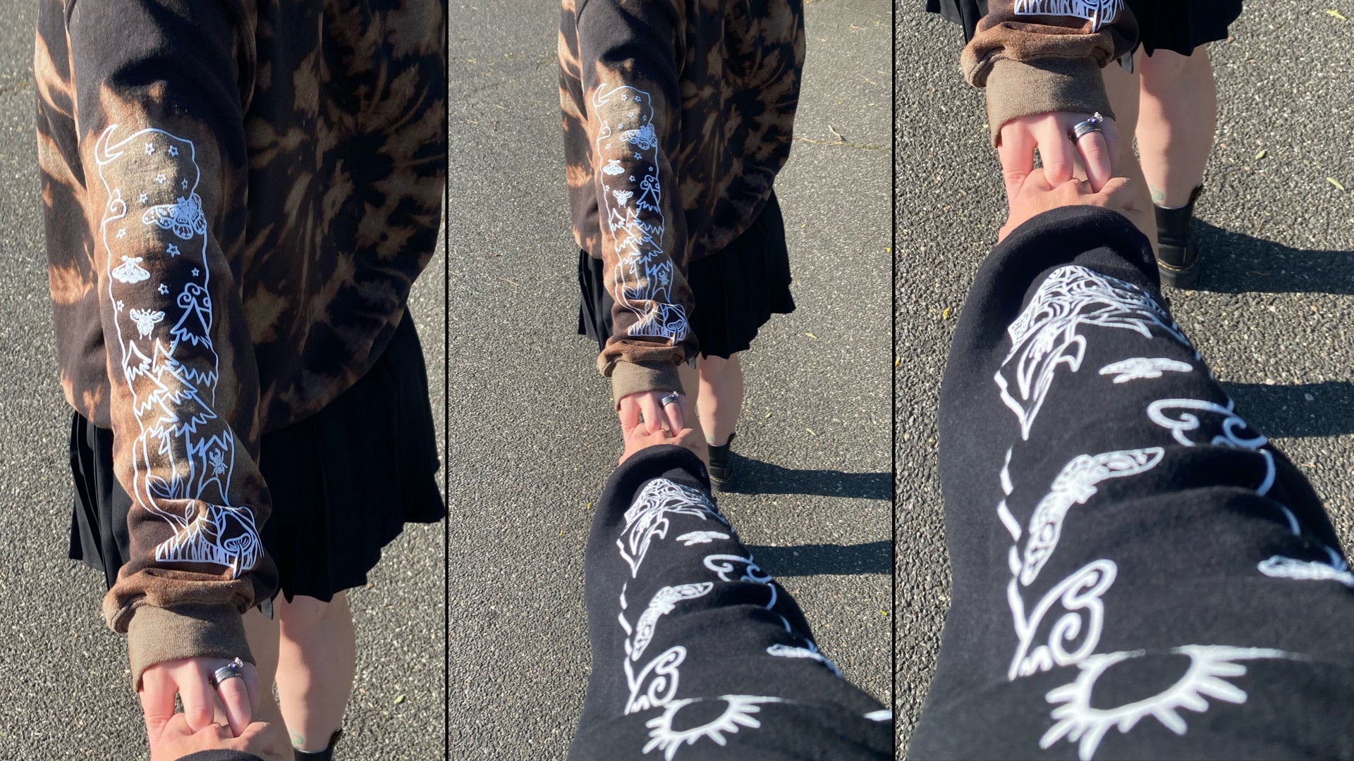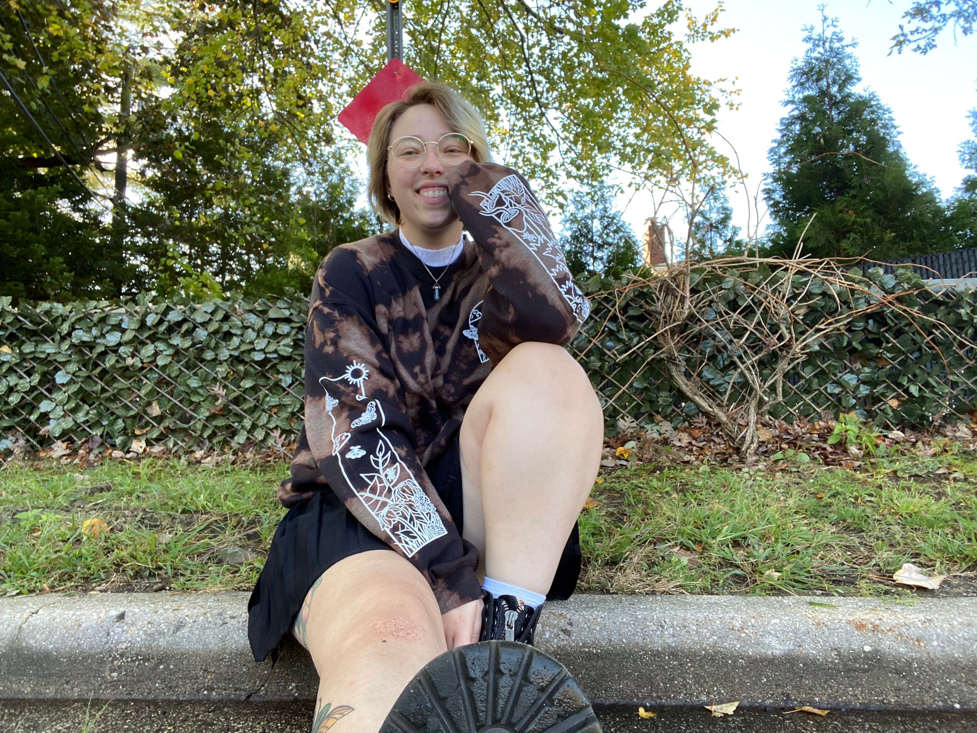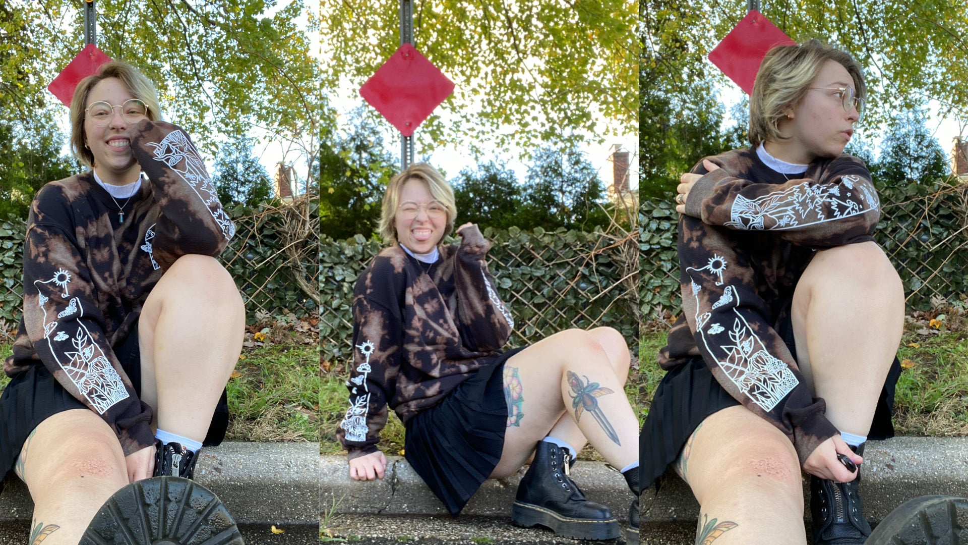 Slater wears the classic black crewneck in a size medium, and the bleached crewneck in a size extra large. Their measurements are 36 (chest) - 28 (natural waist) - 44 (low hip).