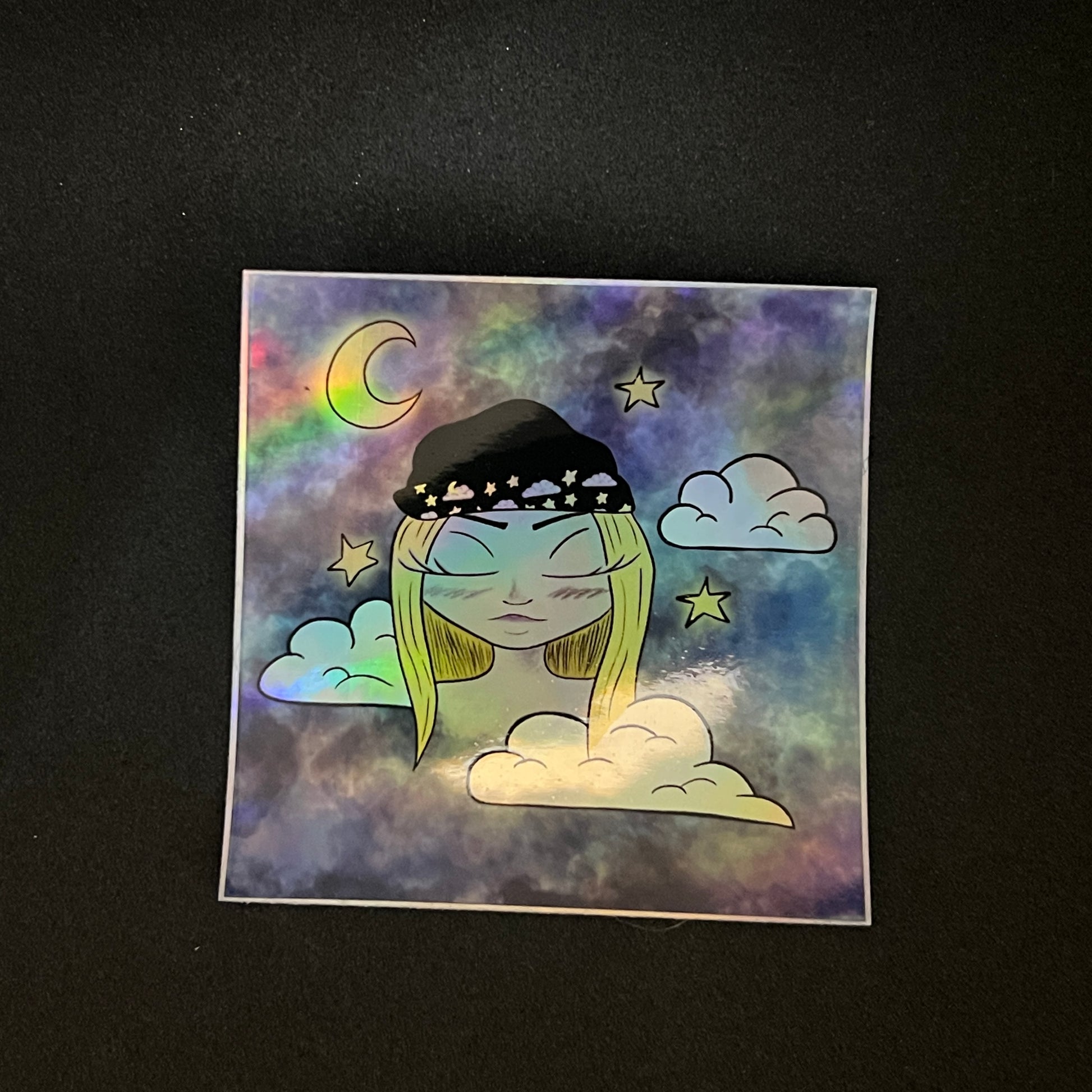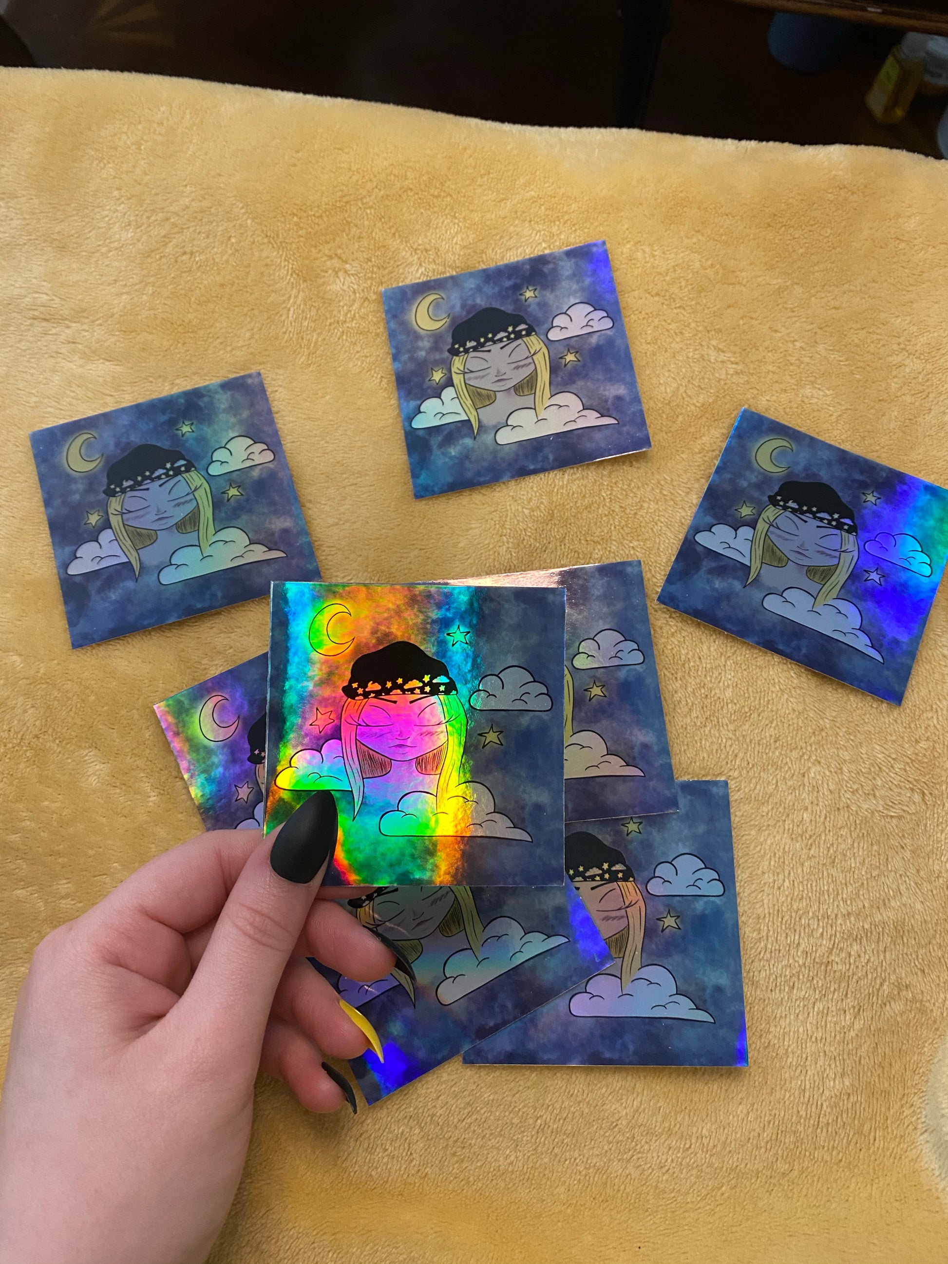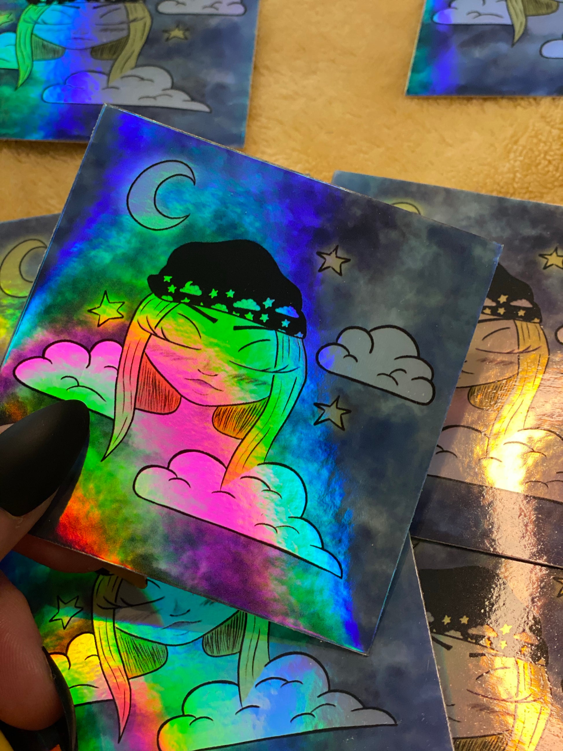 This holographic shiny lady is safe amongst the clouds, what do you think she's thinking about?
