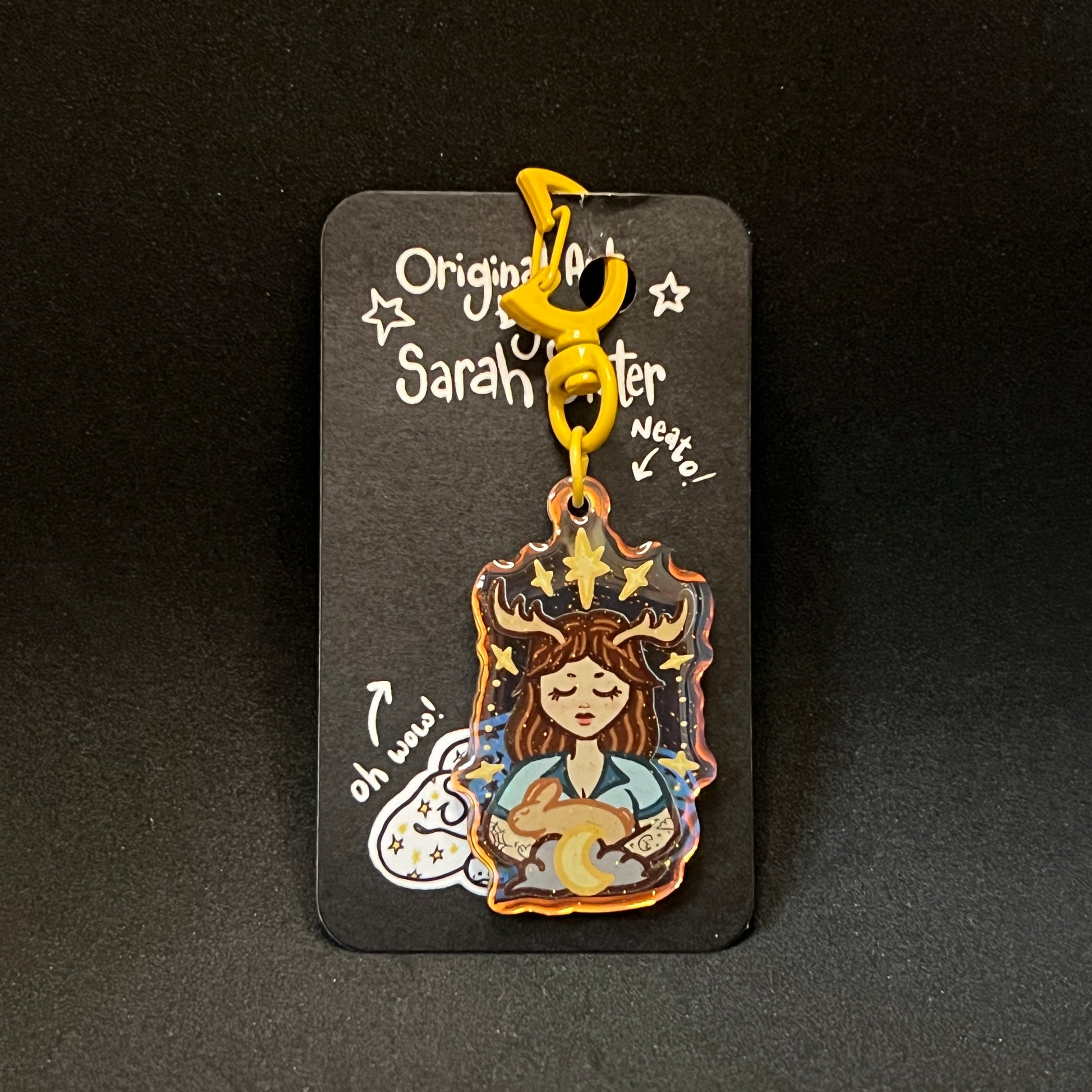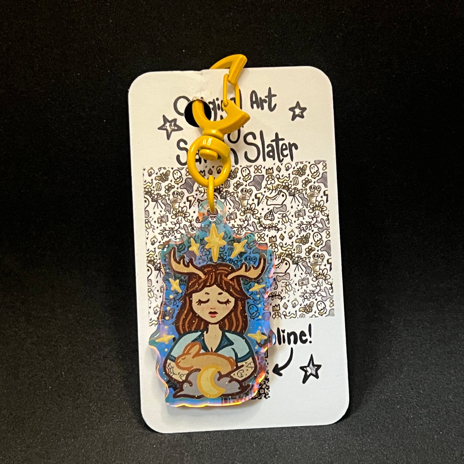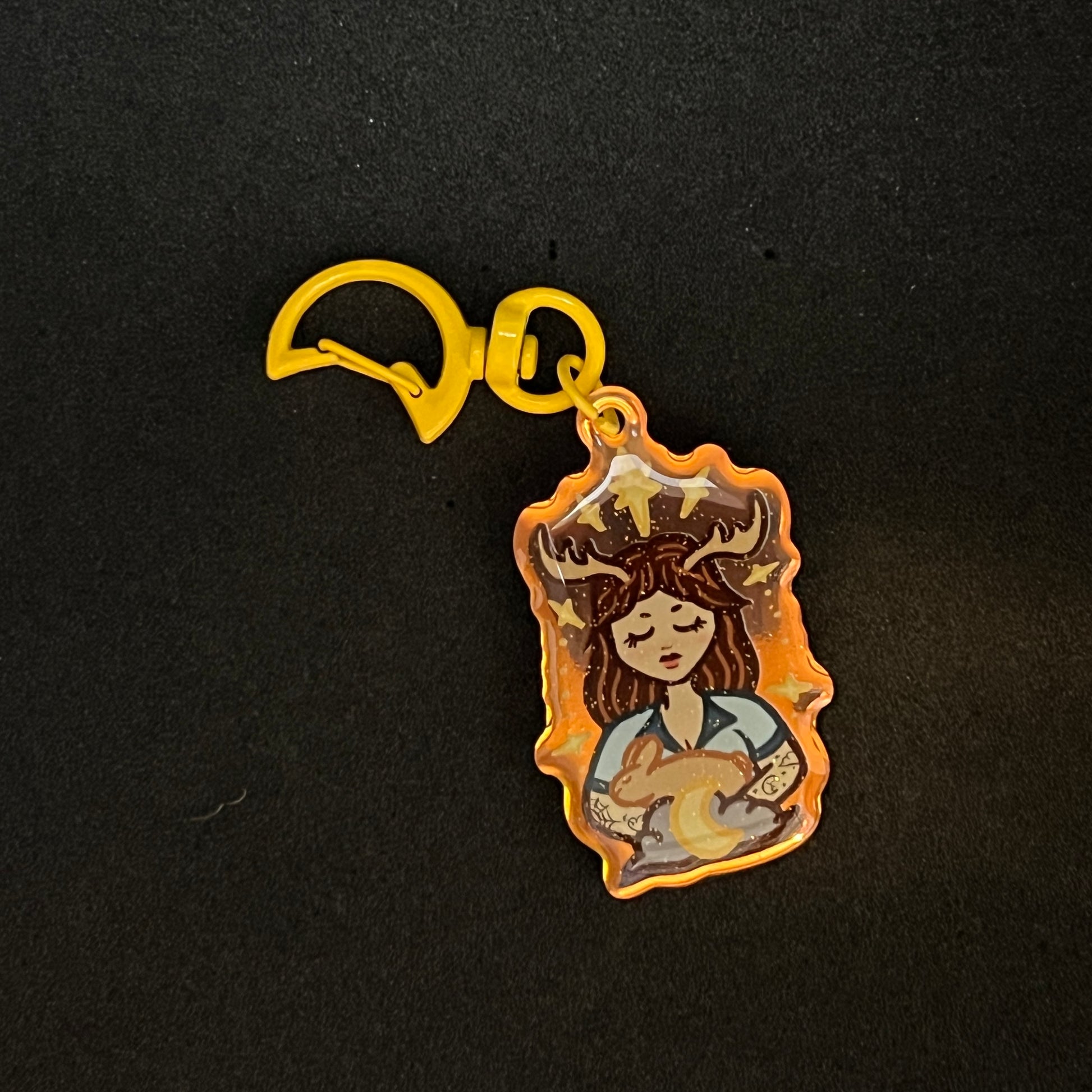 This keychain features the Patreon design from September 2024. The Goddess is cuddling her one of her bunnies, helping her to sleep soundly.