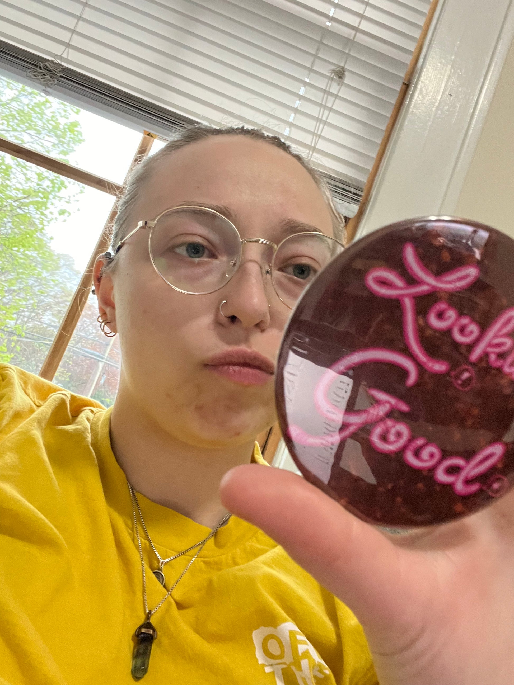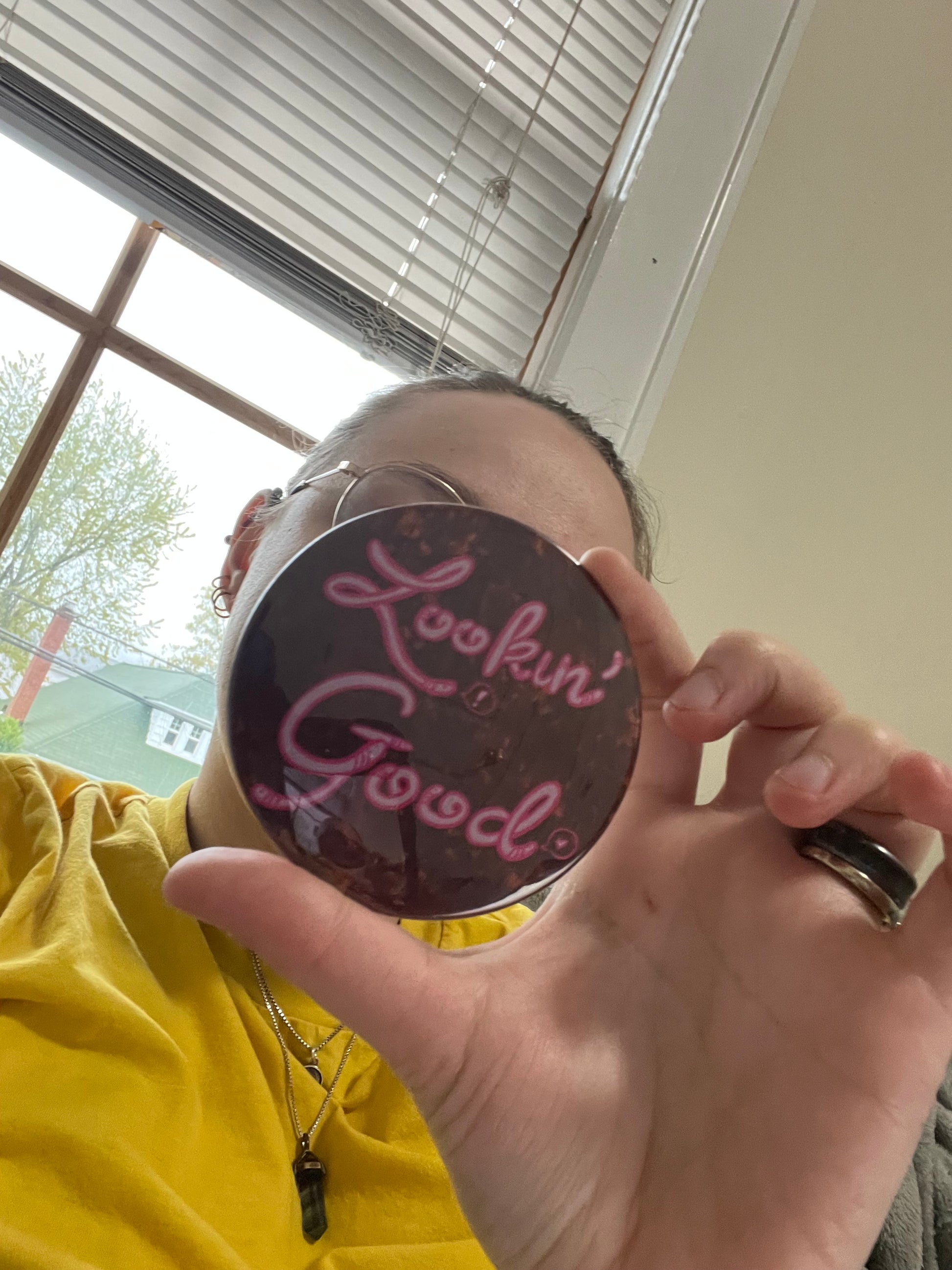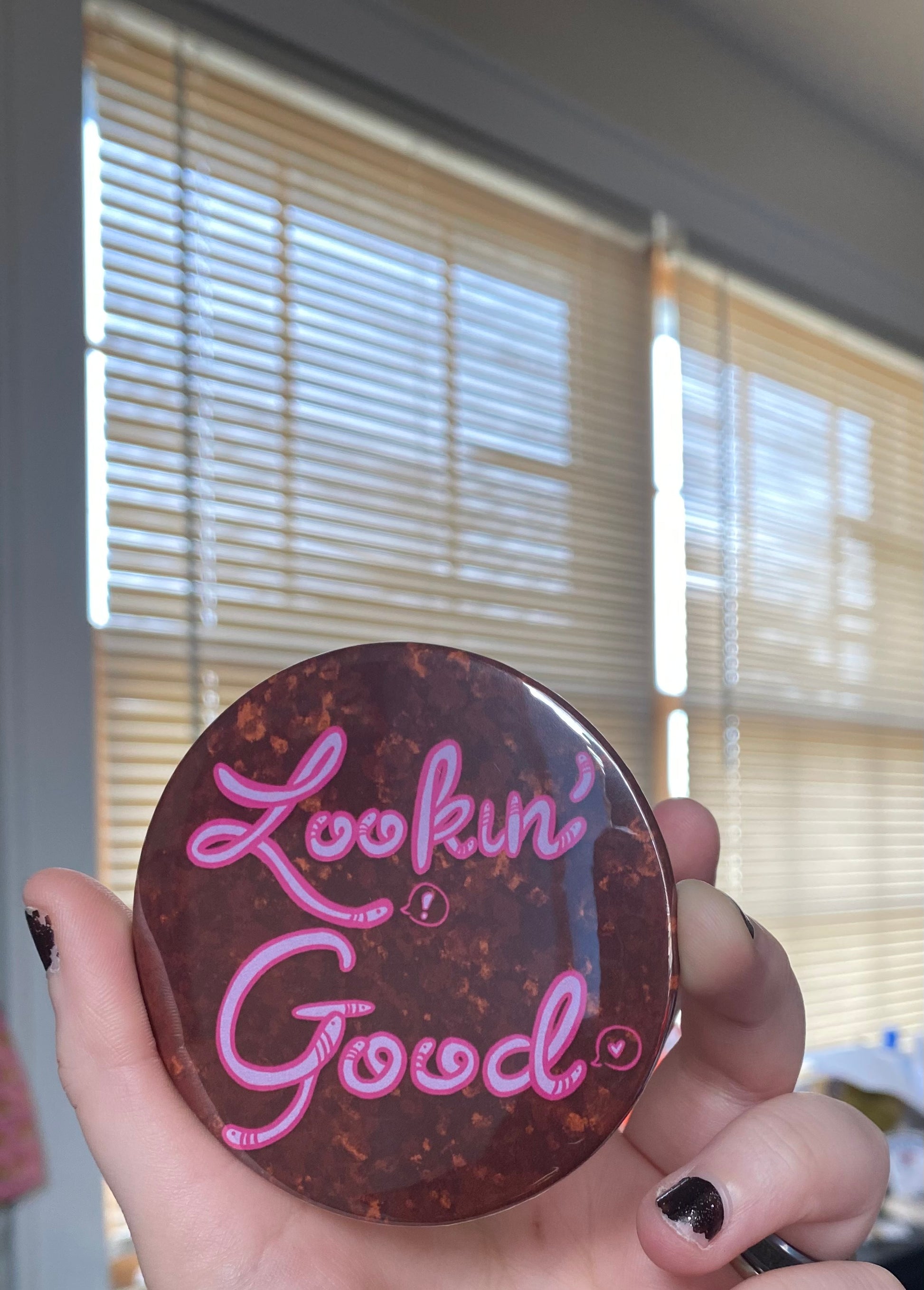 THE WORMS KNOW THE TRUTH - you are loooooooking good! This pocket mirror features the worms telling you that you look good! The worms don't tell lies. Its the truth - you look good. The worms know all things.